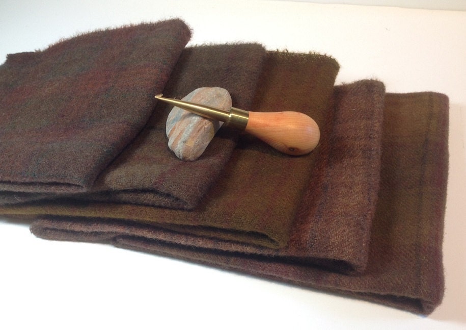 A wonderful addition to your wool stash. One of my favorite backgrounds is a very dark antique black or brown with warm browns like these added for texture and interest. They will be wonderful for leaves, trees, fall foliage, animals, buildings, shadows, fields on landscapes, and more. It is ready for you to use in rug hooking, applique, penny rugs, quilts, sewing projects and craft projects.