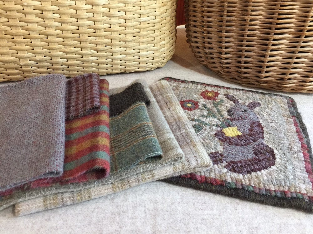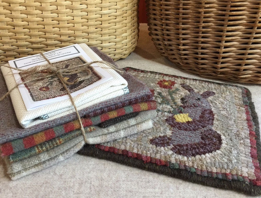 This listing is for the rug hooking kit to hook my design "Spring Bunny" an 8" x 8" hooked rug. This kit has 100% wool fabrics that have been washed