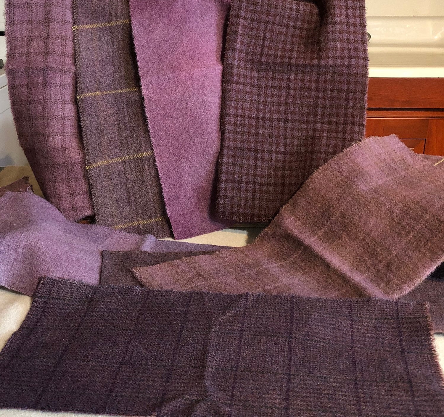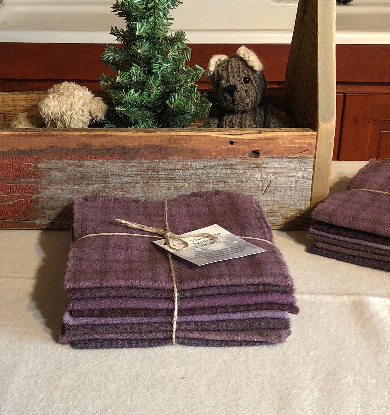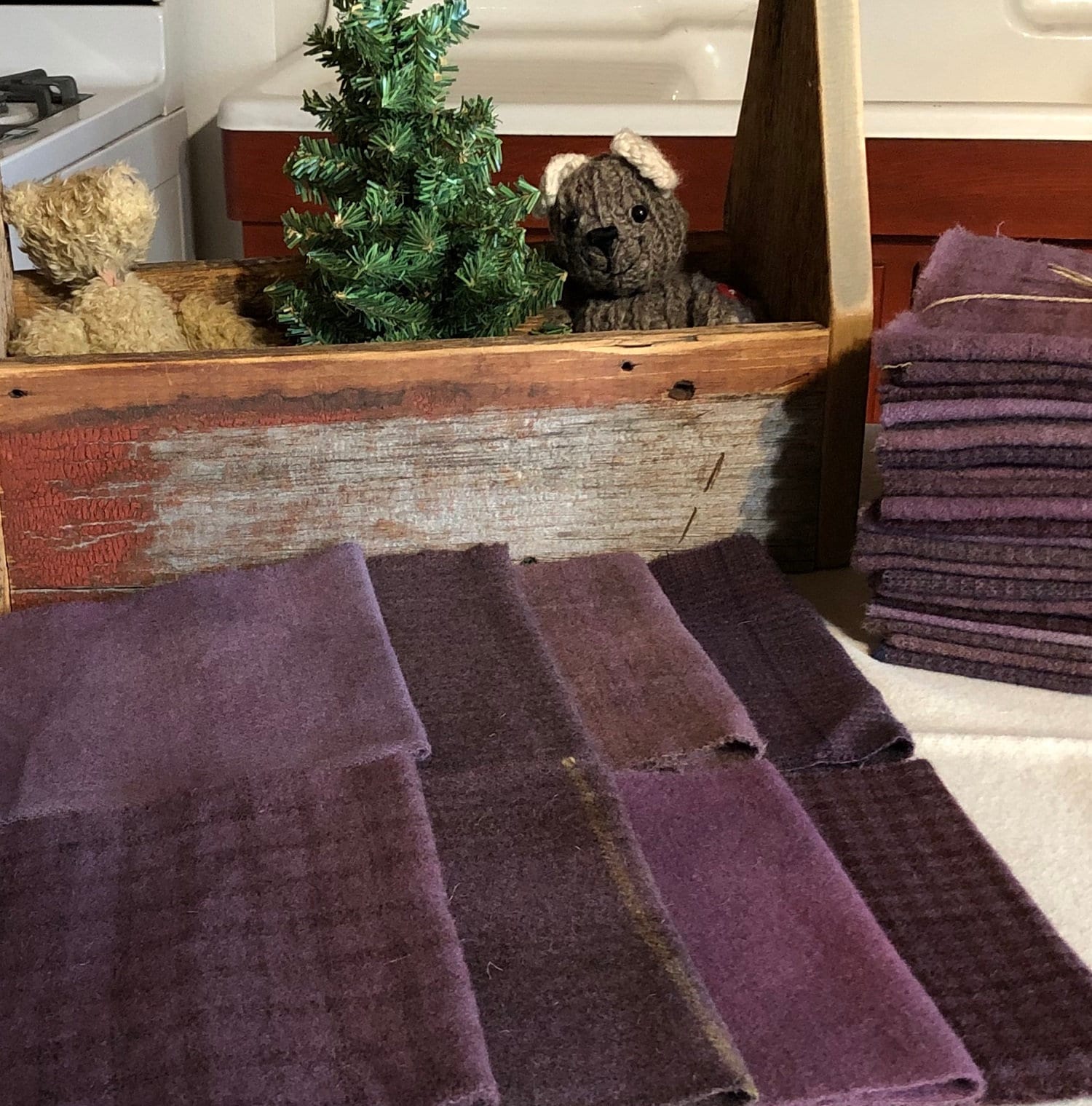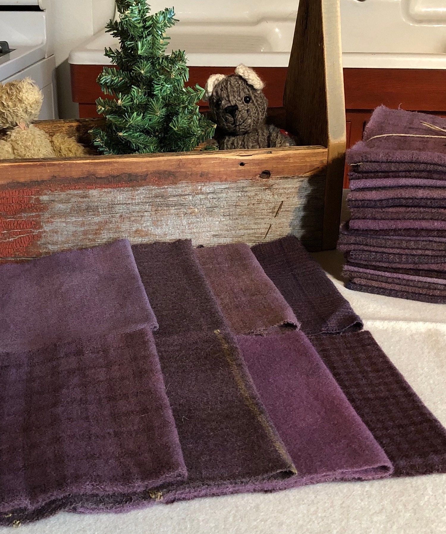This listing is for eight, 1/16 yard pieces of 100% wool fabric. They are hand-dyed colors that I call Shades of Purple Wool Bundle. The size of each is approximately 16" x 7", depending on shrinkage during the felting process and the wool is a medium weight. This wool bundle has 8 interesting plaids and textures ready to add character to any project.