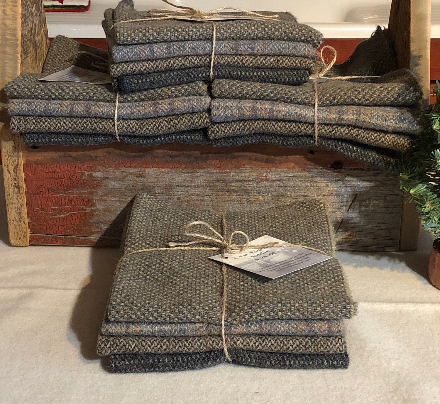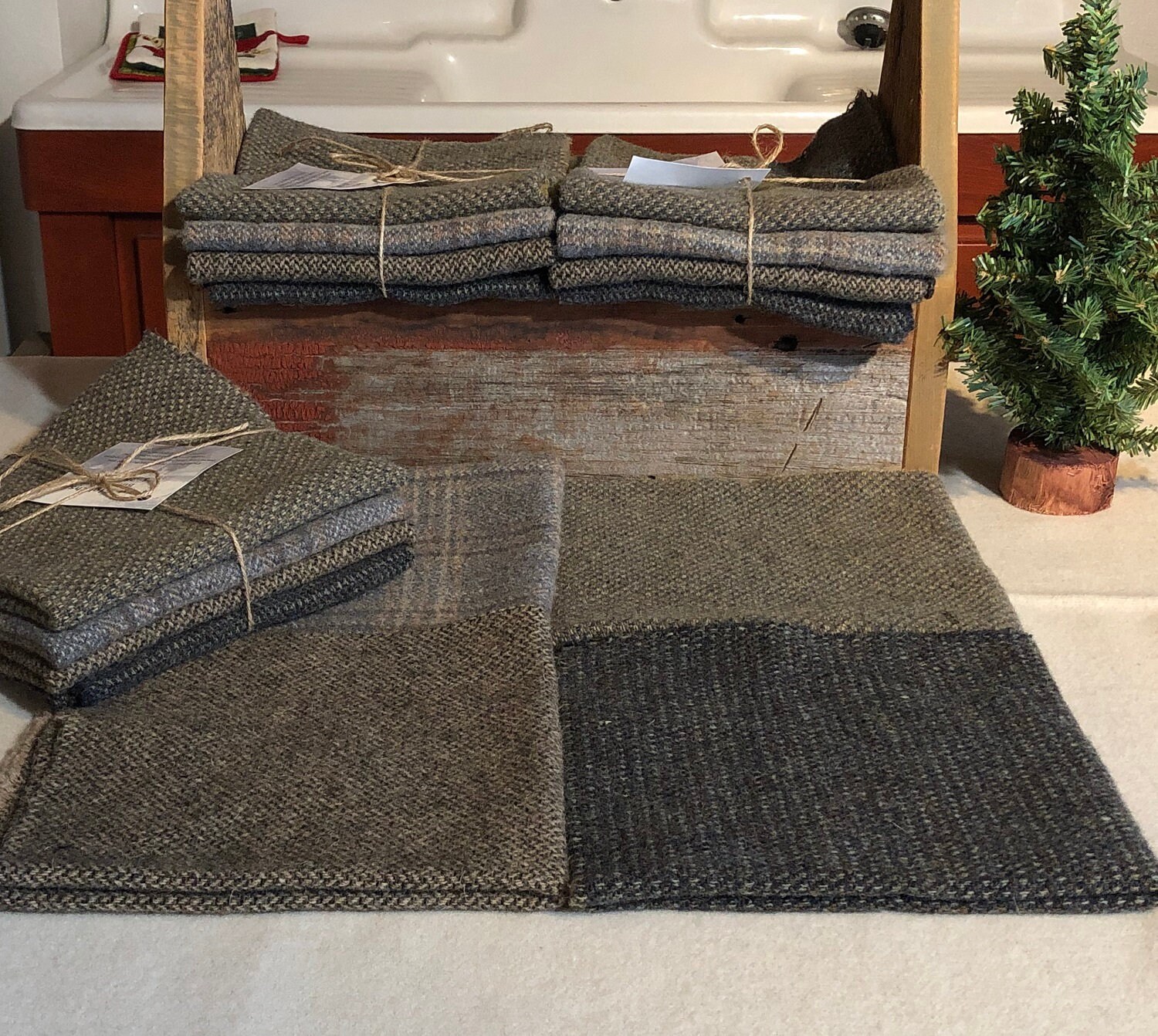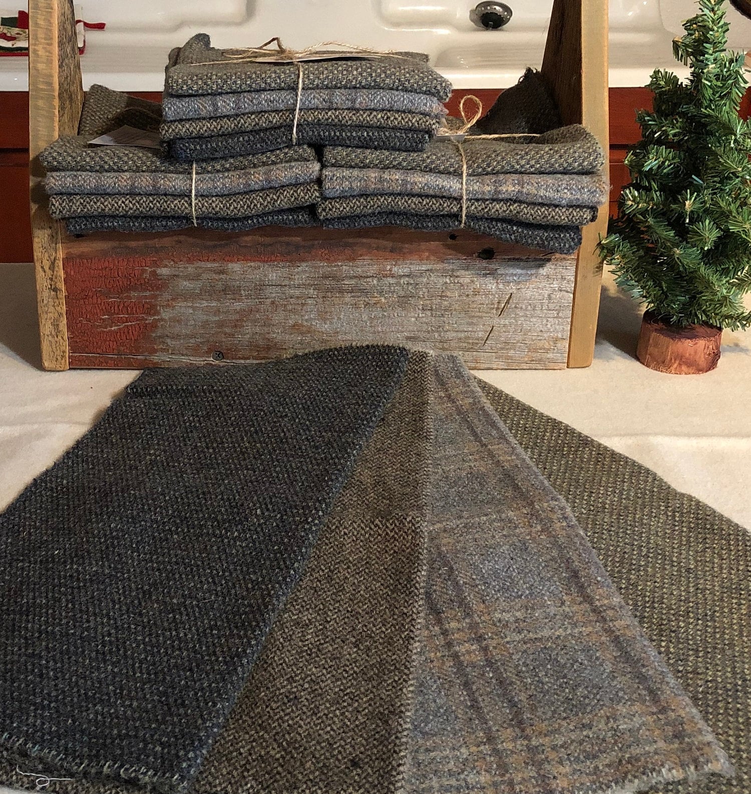 This listing is for 4 one eighth yard pieces of 100% wool fabric. This is a collection of 4 beautiful medium plaids. The result is a soft medium gray bundle that I call "Primitive Background Mix". The size of each is approximately 16" x 14", depending on shrinkage during the felting process and the wool is a medium weight. The plaids and textures in this bundle will add character to any project.